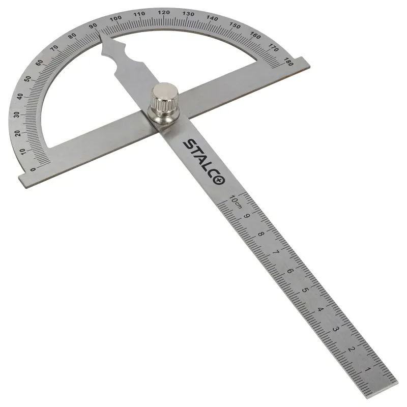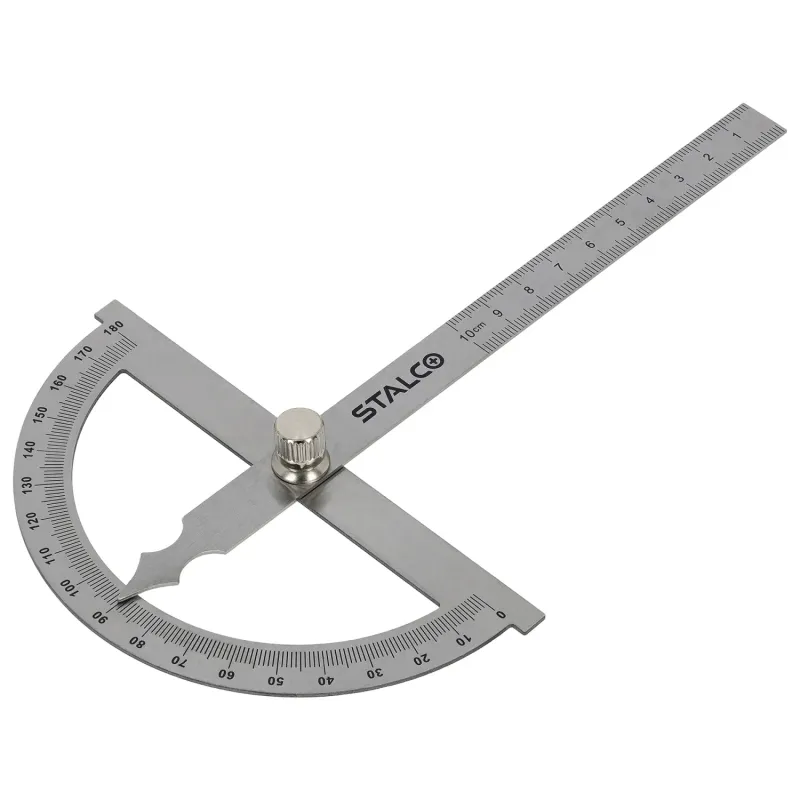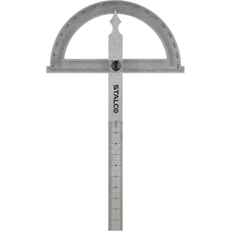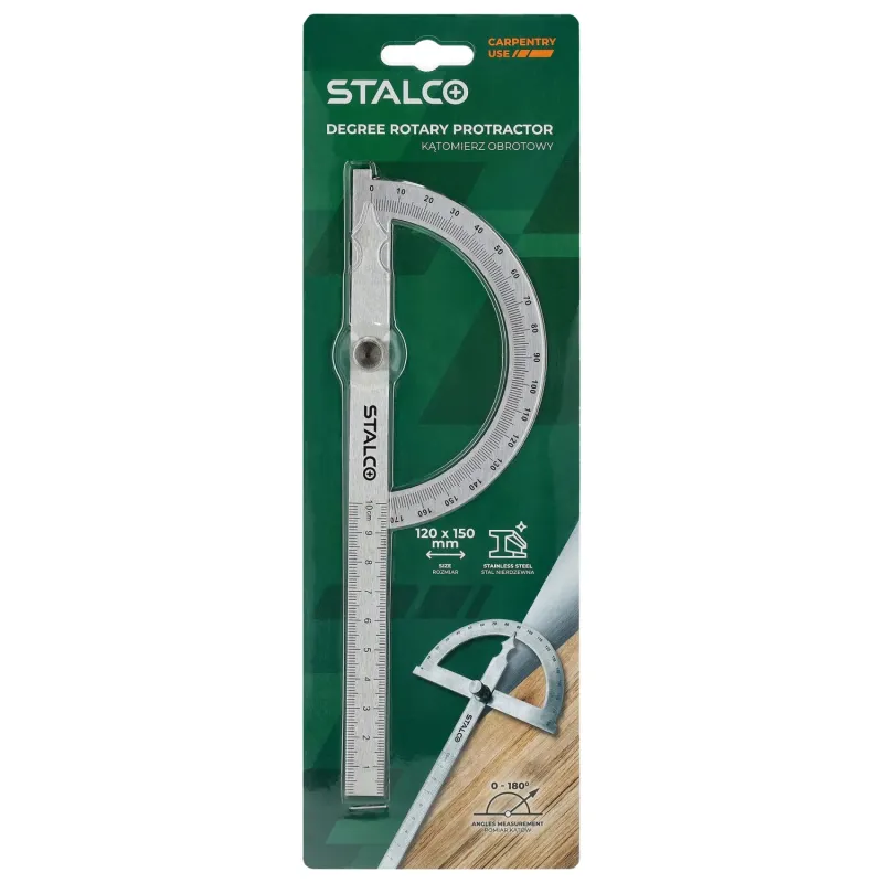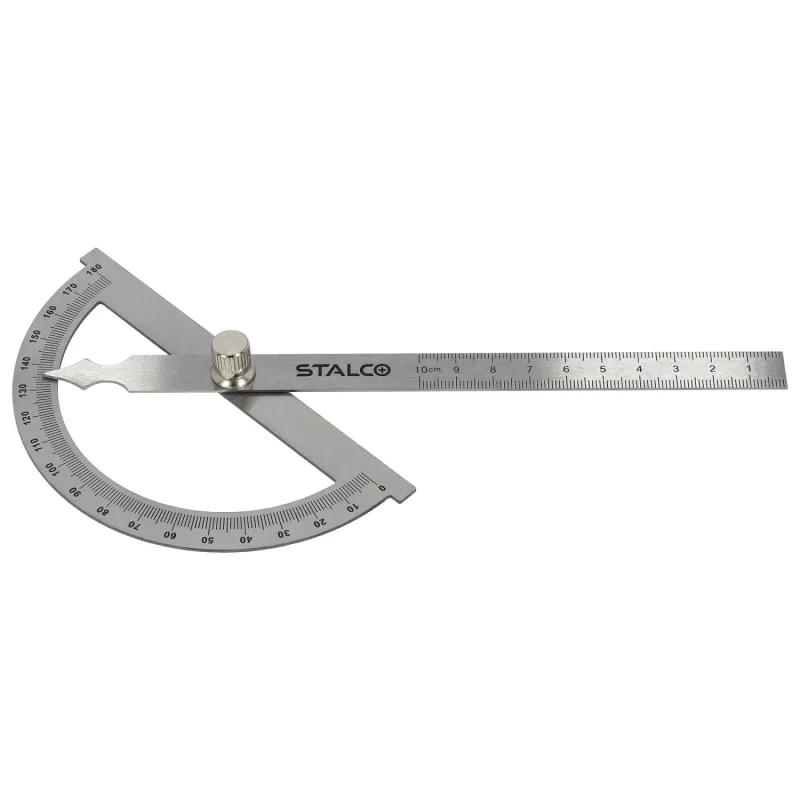 Presný rotačný uhlomer STALCO vyrobený z nehrdzavejúcej ocele s hrúbkou 1,0 mm, určený na presné merania v rozsahu 0 - 180 stupňov.