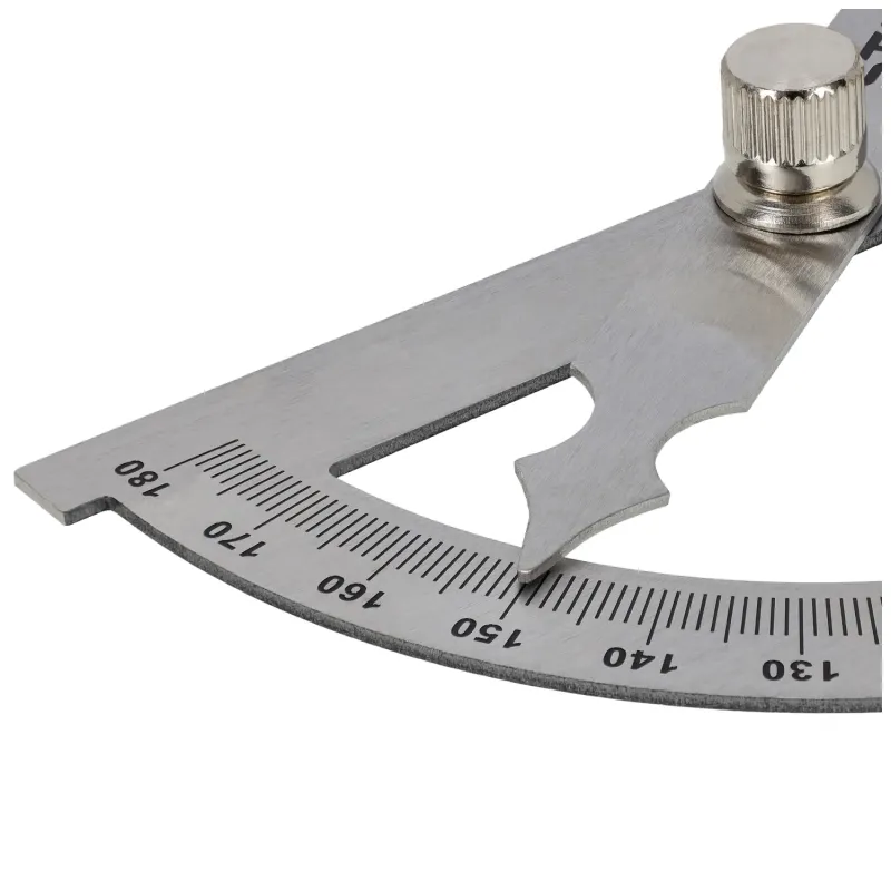 Presný rotačný uhlomer (0 - 180 stupňov) z nehrdzavejúcej ocele. Laserová stupnica a leštený povrch pre dlhú životnosť a čitateľnosť.
