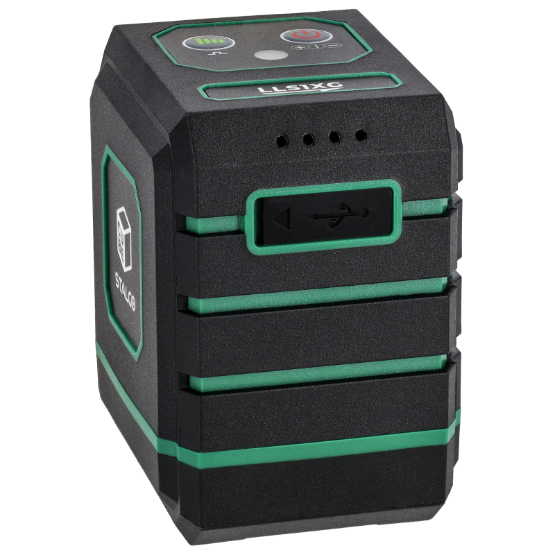 Krížový samonivelačný laser STALCO LLS1XG s jasnou zelenou laserovou čiarou, dosahom 30 m, samoniveláciou a dlhou výdržou batérie pre precízne stavebné a renovačné práce.