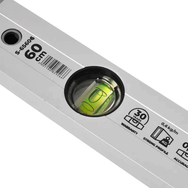 Profesionálna vodováha z eloxovaného hliníka s dĺžkou 60 cm. Presnosť 0.5 mm/m, zväčšovacie libely odolné voči UV žiareniu a nárazom. Záruka 30 rokov na libelu.
