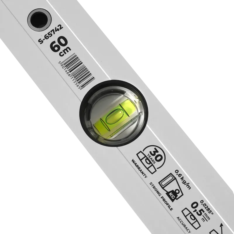 Profesionálna magnetická vodováha (60 cm) pre oceliarov a montérov. Silné magnety, presnosť 0.5 mm/m, zväčšovacie libely s 30-ročnou zárukou. Eloxovaný hliník.