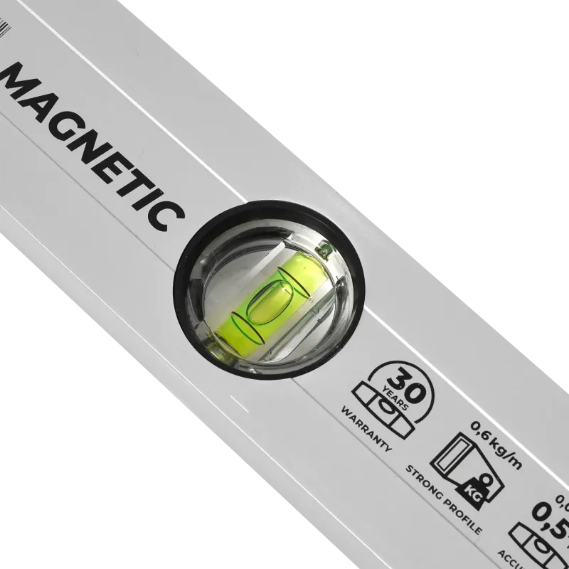 Profesionálna magnetická vodováha (80 cm) pre oceliarov a montérov. Silné magnety, presnosť 0.5 mm/m, zväčšovacie libely s 30-ročnou zárukou. Eloxovaný hliník.