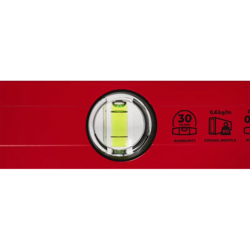 • Špičkové libely (3 kusy): Vybavená antistatickými libelami so zväčšovacou šošovkou pre jednoduchšie odčítanie. Sú plne odolné voči nárazom, UV žiareniu a teplotným výkyvom. Výrobca na ne poskytuje záruku 30 rokov.