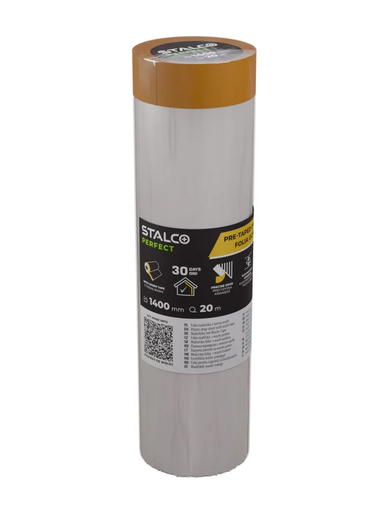 Profesionálna maskovacia fólia (1400 mm x 20 m) s integrovanou washi páskou. Zaručuje perfektne ostré hrany bez podtečenia. Elektrostaticky priľne, UV odolná.