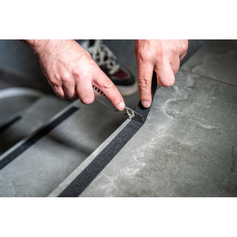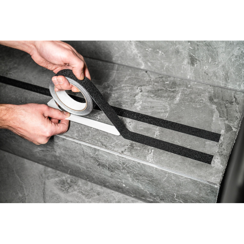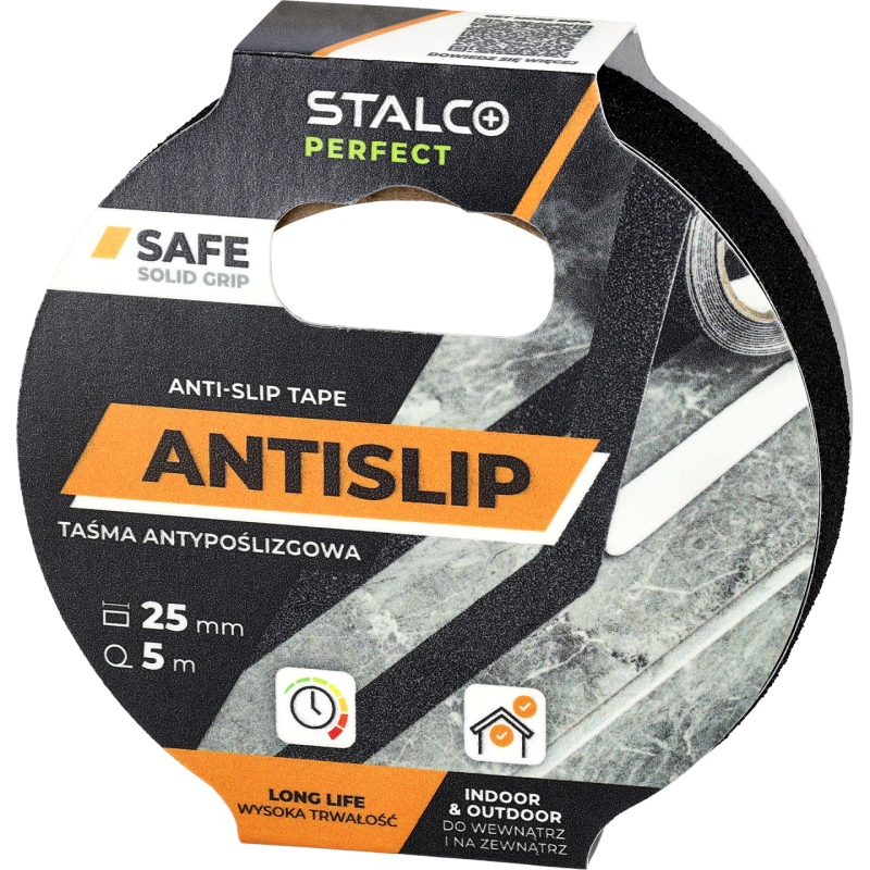 Protišmyková páska STALCO PERFECT (25 mm x 5 m) pre interiér aj exteriér. Ideálna na schody, podlahy a rampy. Silná a odolná ochrana proti pošmyknutiu.