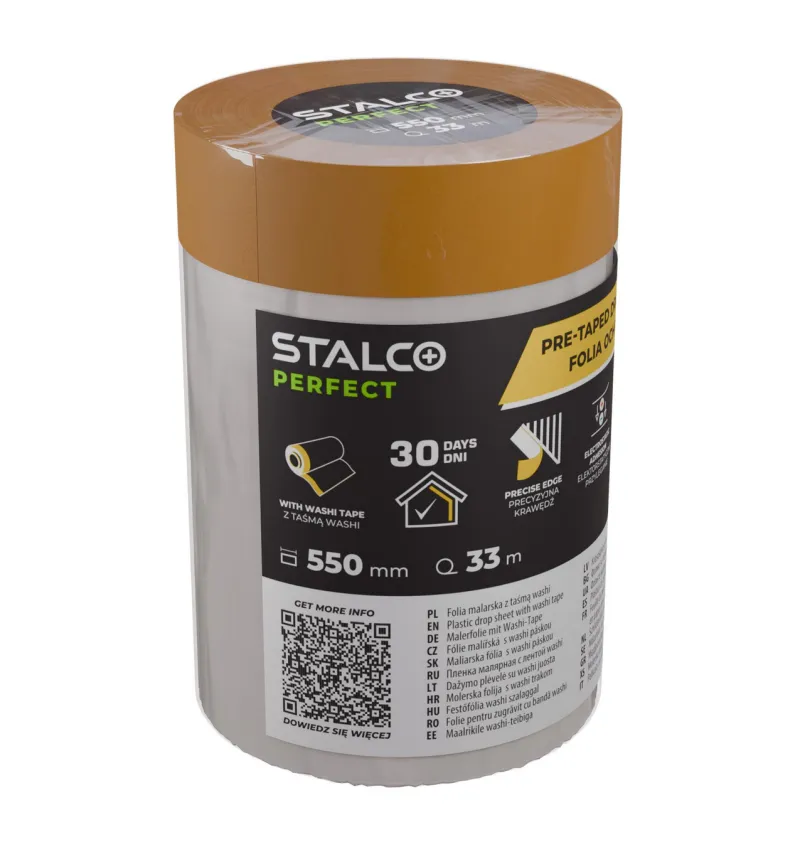 Profesionálna maskovacia fólia (550 mm x 33 m) s integrovanou washi páskou. Zaručuje perfektne ostré hrany bez podtečenia. Elektrostaticky priľne, UV odolná.