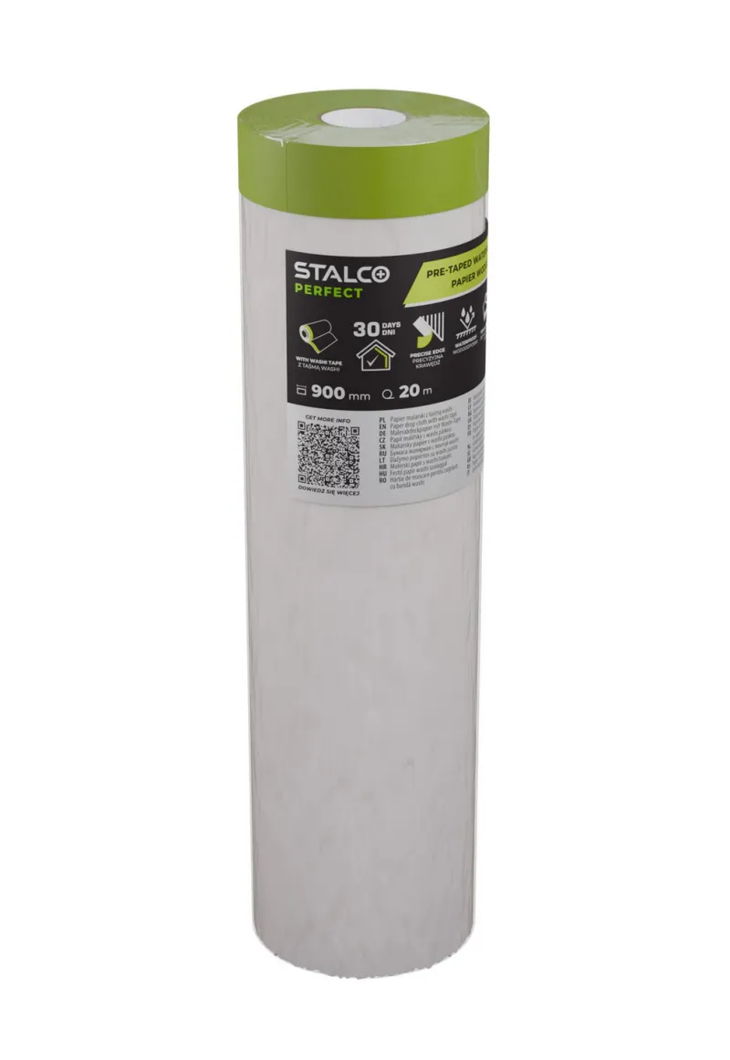 Profesionálny maskovací papier (900 mm x 20 m) s washi páskou. Vodeodolný, potiahnutý papier zabraňuje presiaknutiu. Washi páska zaručuje perfektne ostré hrany. UV odolná.
